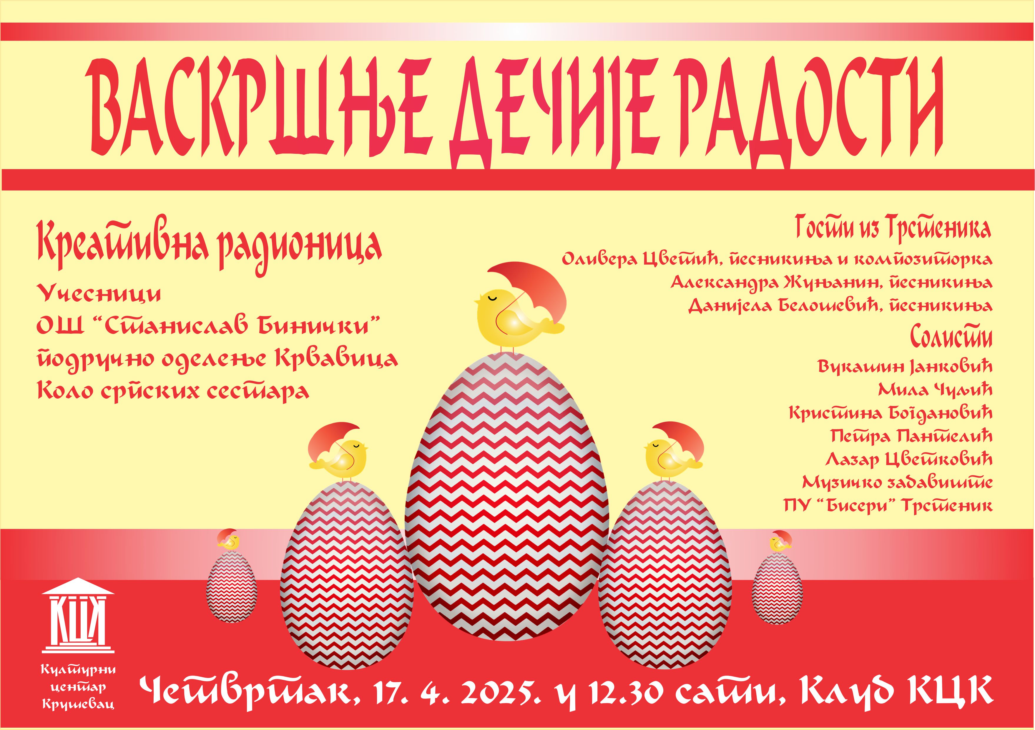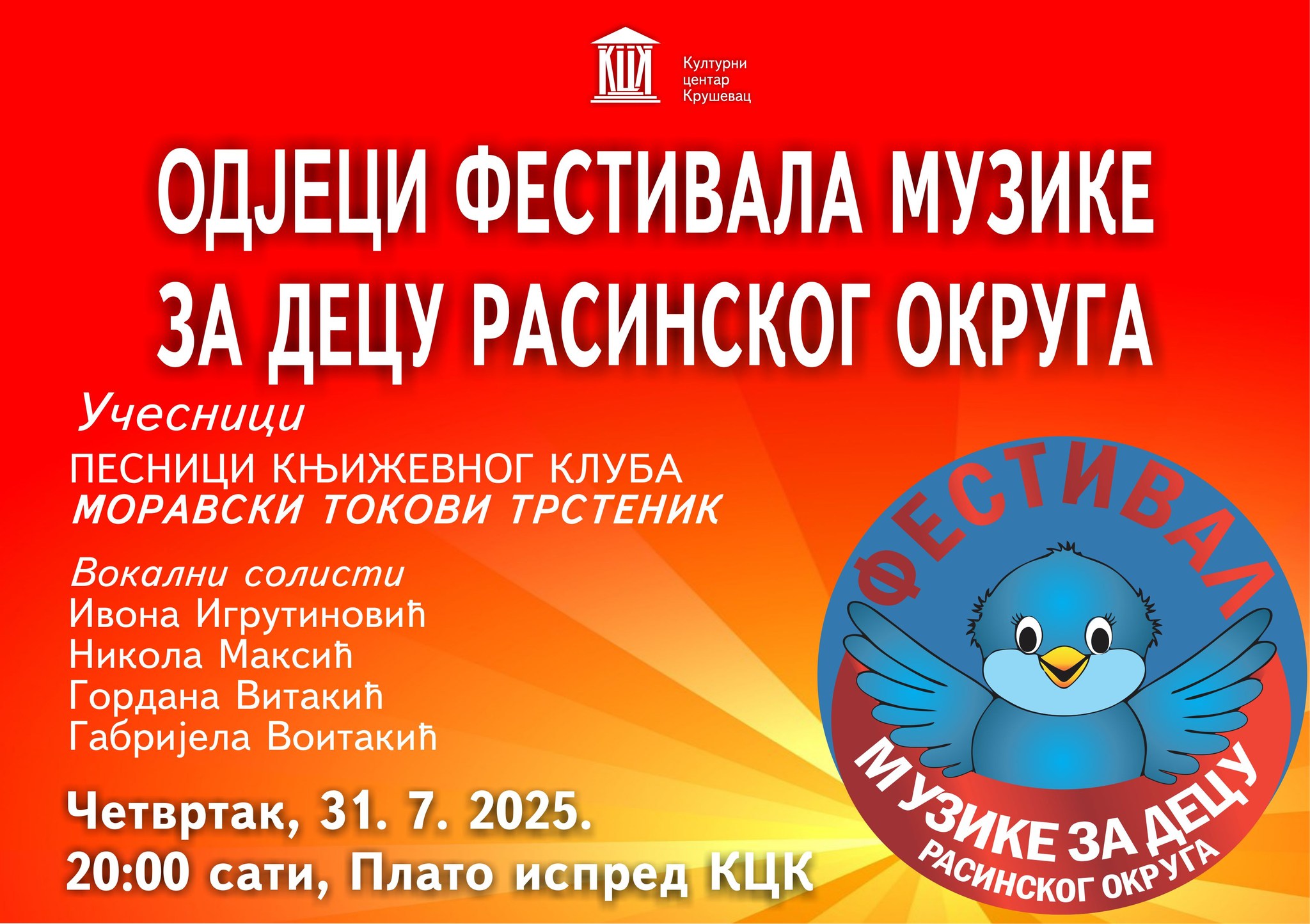 У оквиру ЛЕТА КУЛТУРЕ 2025. на платоу испред Културног центра Крушевац,у четвртак,31.јула, одржано је музичко вече под називом „ Одјеци Фестивала музике за децу Расинског округа“.У програму су учествовали гости из Кнића, солисти Гордана и Габријела Витакић, из Трстеника наступили су солисти Ивона Игрутиновић и Никола Максић. Пред многобројном публиком наступили су песници Књижевног клуба „Моравски токови„ из Трстеника:Оливера Цветић,свештеник Иван Милановић, Милош Милошевић Шика, Данијела Белошевић, Александра Жуњанин, Стефан Миладиновић и Магда Ђорђевић из Кнића.Важно је напоменути да међу гостима, који су учествовали у програму, бројни су аутори чије песме се изводе на такмичарским вечерима Фестивала, а које ови заљубљеници у поезију, музику, културу..поклањају Фестивалу без ауторских хонорара, препознајући важност и значај Фестивала музике за децу Расинског округа.