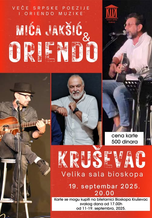 Музичко–поетски састав „Мића Јакшић и Ориендо“ одржали су концерт у Биоскопу Крушевац, у петак, 19. септембра 2025. У целовечерњем наступу под називом „ Музика и поезија о љубави, лепоти и срећи“ изведени су најлепши стихови поетских великана, популарне нумере наше народне и поп музике компоновани у ориендо стилу, као поезија из опуса песника Миодрага Миће Јакшића. Публика је уживала у стиховима великана попут Ђуре Јакшића, Диса, Десанке Максимовић, Душка Радовића, Црњанског, Шантића, Ракића, Дучића...али су се чуле и песме које се уздижу изнад свог времена и стила и престају бити народне, забавне попут песама Боре Ђорђевића, Тозовца, Бајаге, Хариса, Томе Здравковића, Мића Јакшић, члан саства каже: „Ориендо је музика душе. То није само жанр, већ израз емоције кроз звук, спој различитих традиција: фламенка, оријенталних мелодија, циганске страсти и балканске душе. То је поезија која се пева, плаче и свира у истом тренутку.“